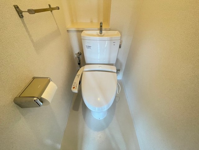 トイレは独立性が高く、落ち着いて使える空間設計。シンプルながら清潔感があり、日常的に快適に利用できます。収納スペースも確保されているため、掃除用具や備品を目立たせずに保管でき、生活感を抑えられるのも嬉しいポイントです。