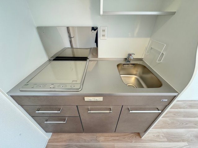 キッチンはコンパクトながら機能的なシステムキッチンを採用。作業スペースが確保されており、調理家電も置きやすい設計です。収納も上下に備えられ、調理器具や食器をすっきり整理できます。