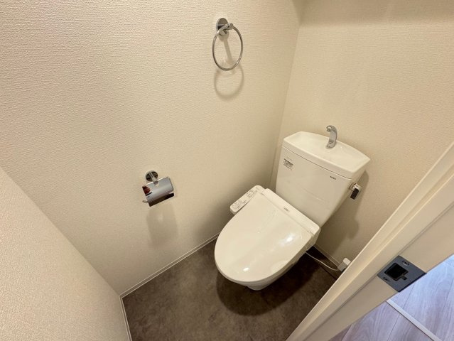 トイレは温水洗浄便座付きで、清潔感のある内装。上部収納棚が設けられているタイプもあり、日用品のストックにも配慮されています。